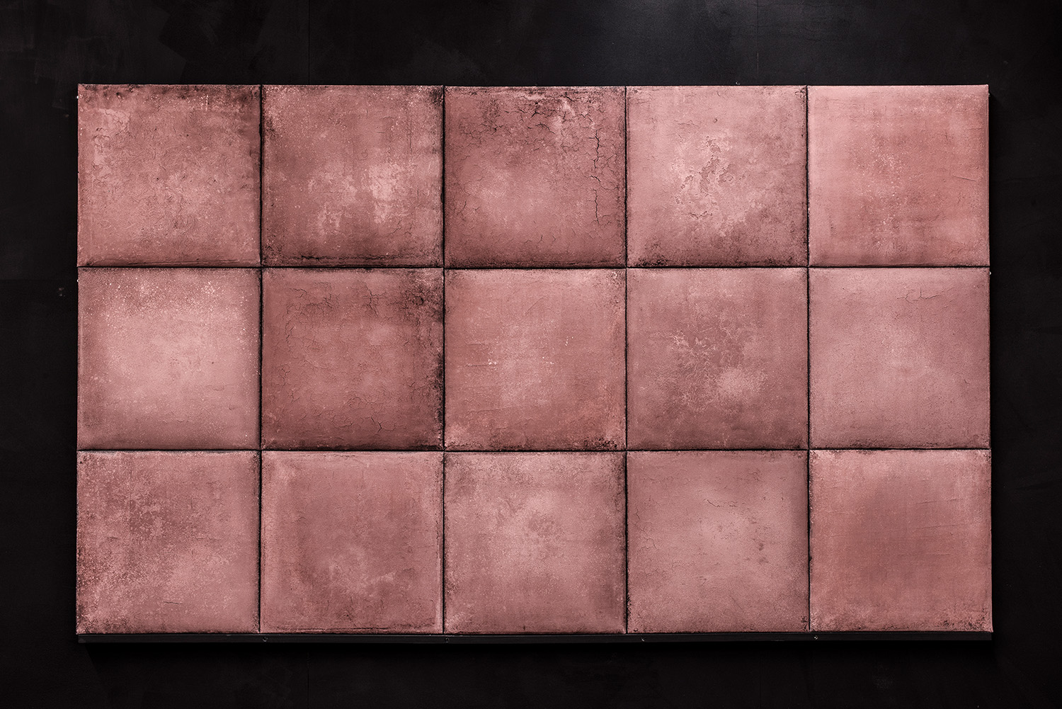 Die Pulver und Farbpigmente sind für Raphael Kleinstein Motiv, Motivation und Obsession. Mit ihnen verfolgt er das Ziel des Forschers, den Dingen auf den Grund zu gehen. Und was wäre grundsätzlicher als der Staub, aus dem alles entsteht und zu dem alles wieder zerfällt. Der Staub der farbigen Erde. Den archaischen Charakter dieses Staubs, dieser Urfarben wollte er bildnerisch inszenieren. Dazu musste er ganz neue Verfahren entwickeln, denn die unmittelbare Kraft und enorme Intensität der Pigmente war nicht mit einfachen Mitteln auf die Leinwand zu bringen. In den letzten drei Jahren war seine Werkstatt daher Schauplatz unzähliger Experimente und Versuche. Schliesslich gelang es ihm, die Pigmente so in Szene zu setzen, wie er es sich vorgestellt hatte: roh, farbstark, unverfälscht und kraftvoll. Alles Eigenschaften, die auch den Prozess vom Pigment zum ferigen Pad prägten. Ein schöpferischer Akt, bestimmt nicht nur von sensibler Wahrnehmung, sondern auch von groben Arbeiten und roher Kraft: Trägermaterial, Grundierungen und Untermalungen werden gewalzt, gepresst, gehämmert, die Pigmente gespachtelt, gemalt und eingearbeitet. Im Atelier ist es oft ohrenbetäubend laut, stickig und staubig, ein Arbeiten in dieser Atmosphäre ist ohne Staubschutzmaske ist nicht denkbar. Terra Pads nennt Raphael Kleinstein seine neuste Serie. In ihrer Strenge erinnern die Bilder an Design-Objekte. Jedes Objekt besteht aus drei Reihen mit je fünf Kacheln. Was diese verbindet, ist ihre leicht konvexe Oberfläche und die Grundfarbe, was sie unterscheidet, sind Nuancen der Schattierung und Feinheiten der Oberflächenstruktur. Durch diese Unterschiede entsteht ein vielfältiges Wechselspiel zwischen den verschiedenen individuellen Pads und letztlich ein Dialog zwischen Bild und Betrachter.